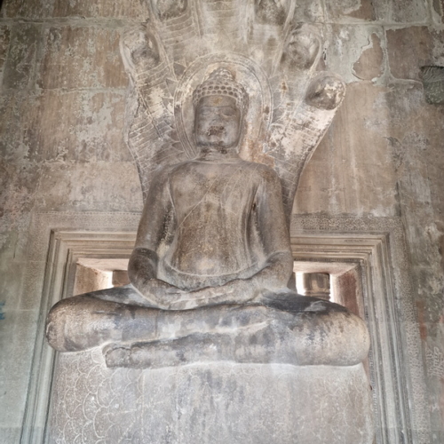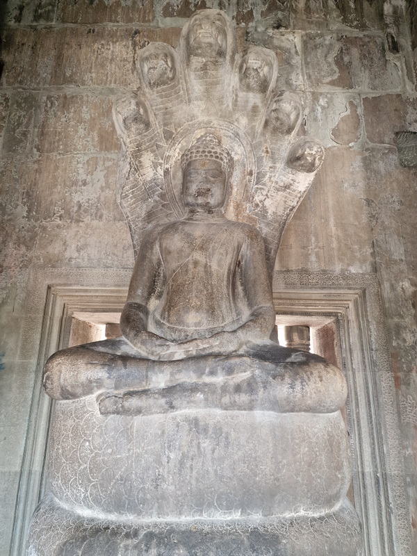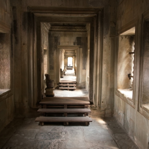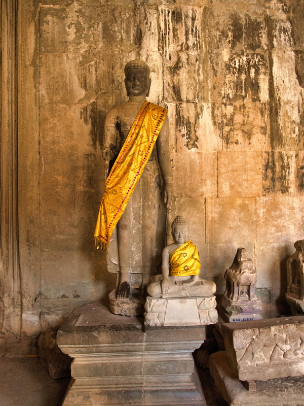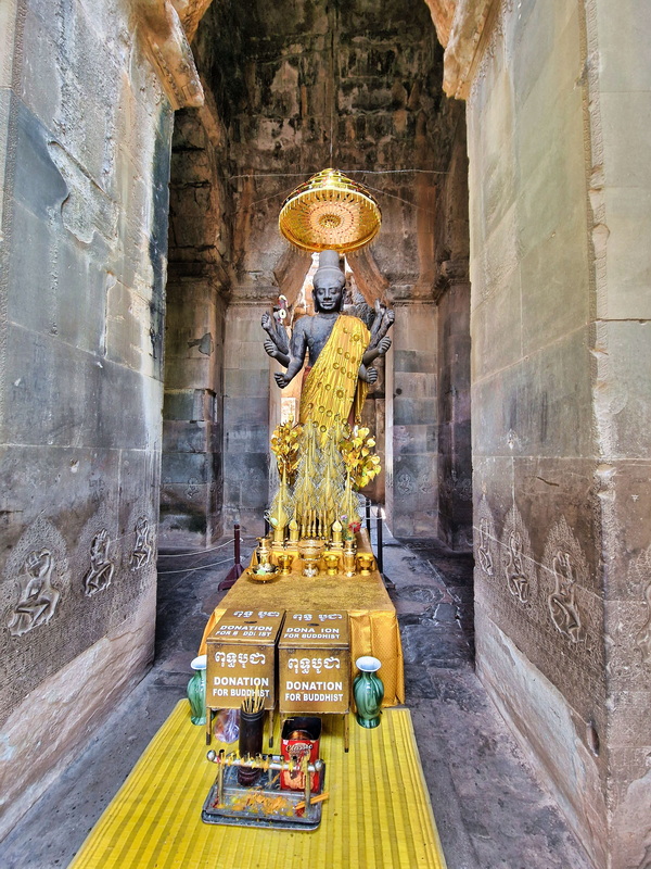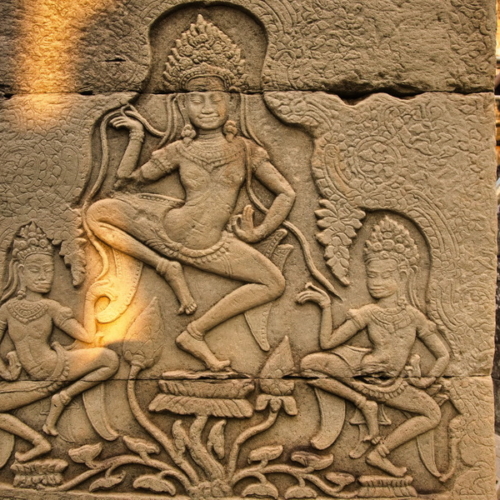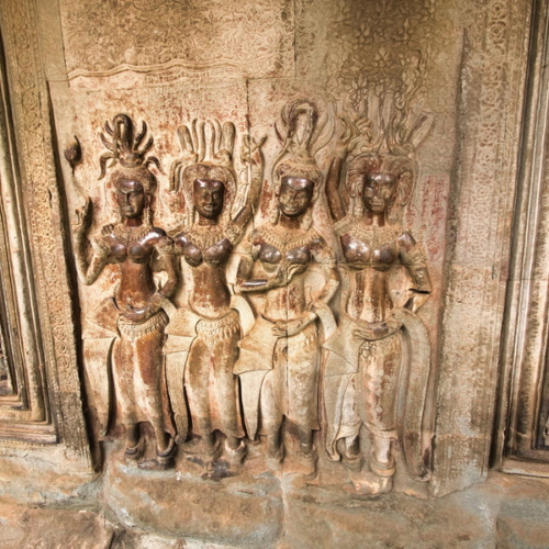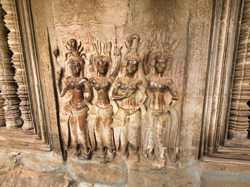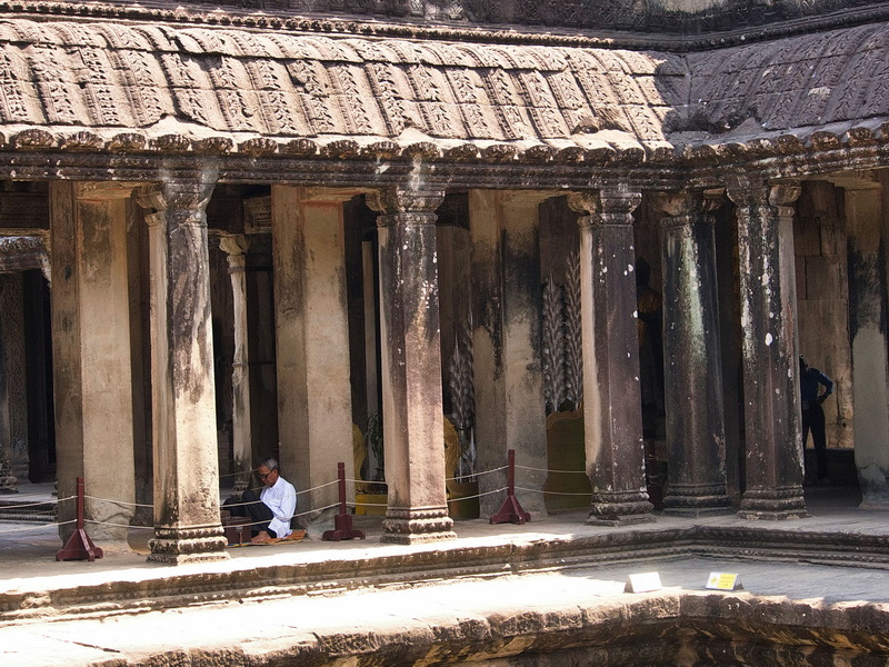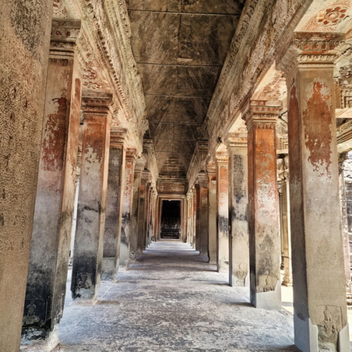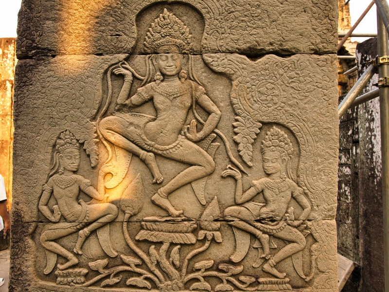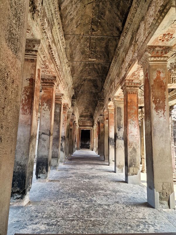 Nachdem wir durch die dritte Galerie getreten waren, standen wir im inneren Hof – direkt am Fuß des zentralen Tempels. Die Atmosphäre war spürbar anders: ruhiger, konzentrierter. Ein junger Mönch, der mit seiner Mutter durch den Hof ging, verstärkte diesen Eindruck. Um uns herum erhoben sich die dunklen Steinmauern, unterbrochen von kunstvoll gearbeiteten Säulen und Nischen, in denen die bekannten Apsaras – in Stein gemeißelte Himmelswesen – zu sehen waren.