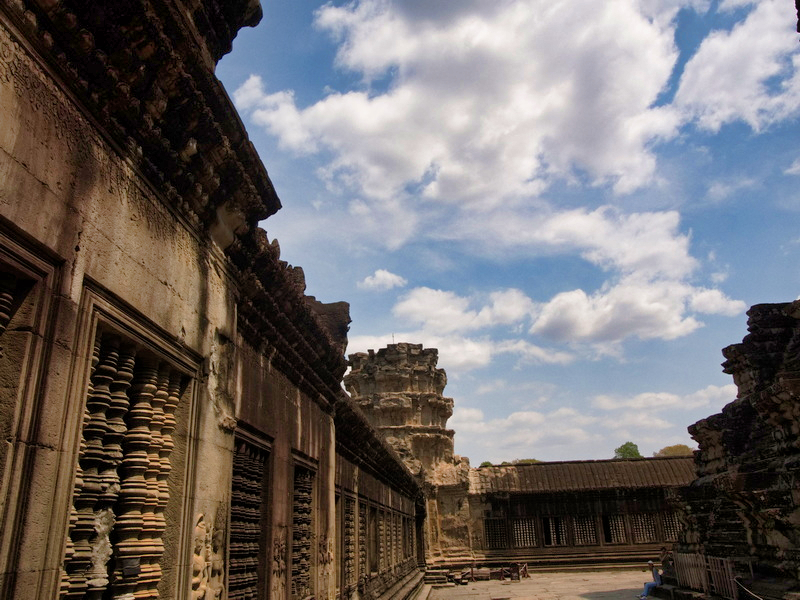 Hinter der nächsten Ecke gelangten wir wieder in einen der Innenhöfe. Noch befanden wir uns innerhalb der innersten Galerie rund um den Hauptturm. In einem der Pavillons liefen gerade Restaurierungsarbeiten. Das Gebäude war eingerüstet, und mehrere Arbeiter waren damit beschäftigt, Steine zu sichern und beschädigte Stellen auszubessern.