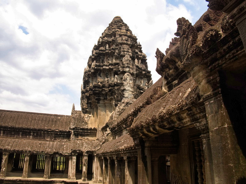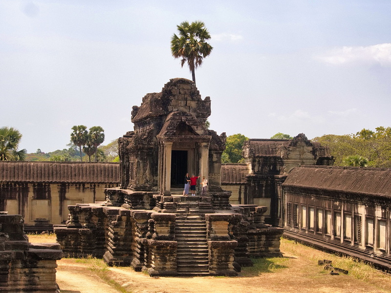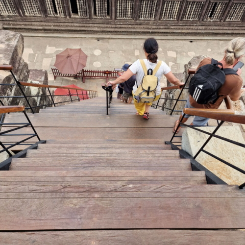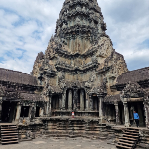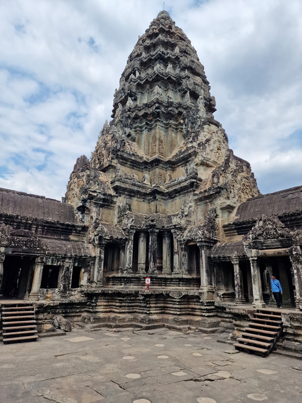 In der Mitte führte eine steile Treppe hinauf zum Hauptturm, dem heiligsten Teil der Anlage. Wir verweilten einen Moment auf den Steinterrassen und ließen die Stimmung auf uns wirken. Durch die wenigen Besucher wirkte der Innenhof wie eine Art Schwelle – zwischen der äußeren Welt und dem spirituellen Zentrum von Angkor Wat.