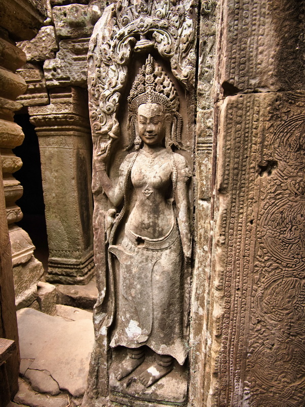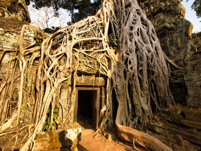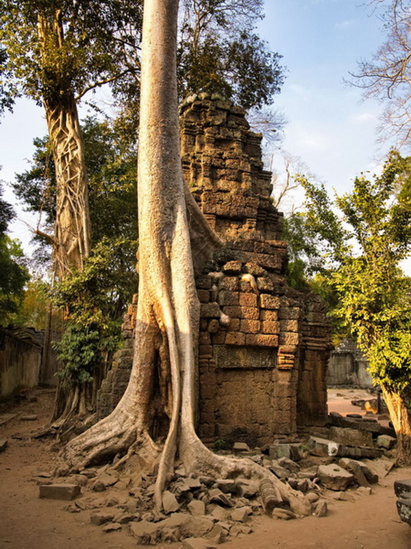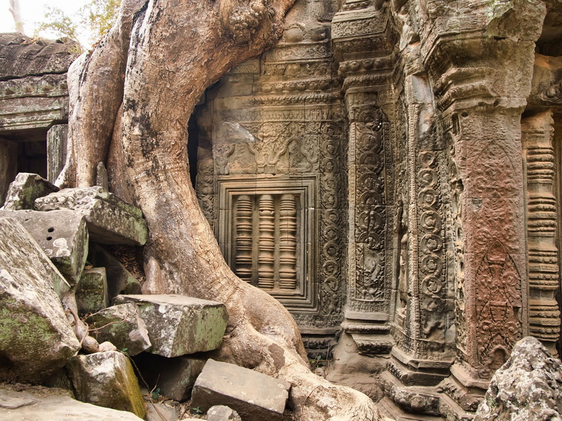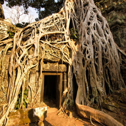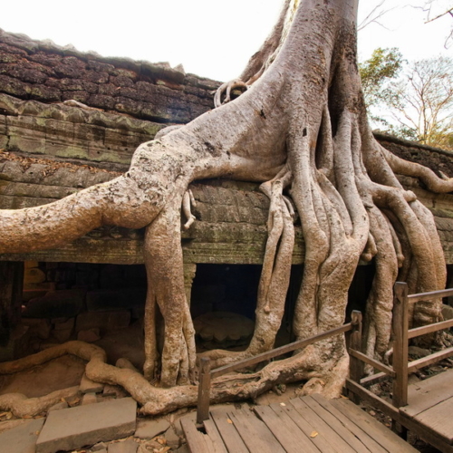 Besonders eindrucksvoll sind die riesigen Wurzeln der Feigen- und Spung-Bäume, die sich quer über Türöffnungen legen oder Mauern durchbrechen. Einige dieser Stellen sind so ikonisch, dass sie sogar als Kulisse für den Film Tomb Raider mit Angelina Jolie dienten – was dem Tempel zusätzlich Bekanntheit verschafft hat. An mehreren Orten fühlt man sich tatsächlich wie mitten in einer Filmszene.
