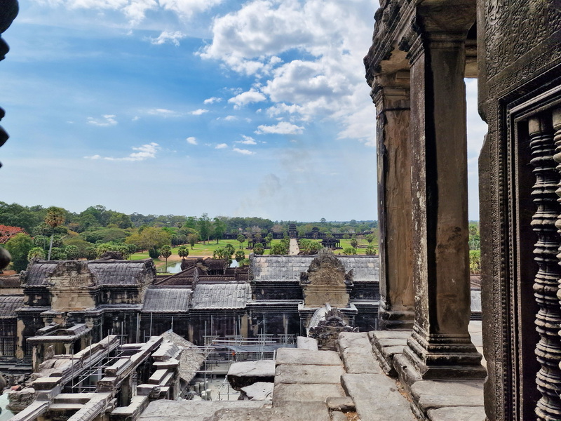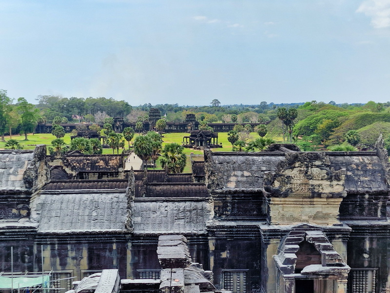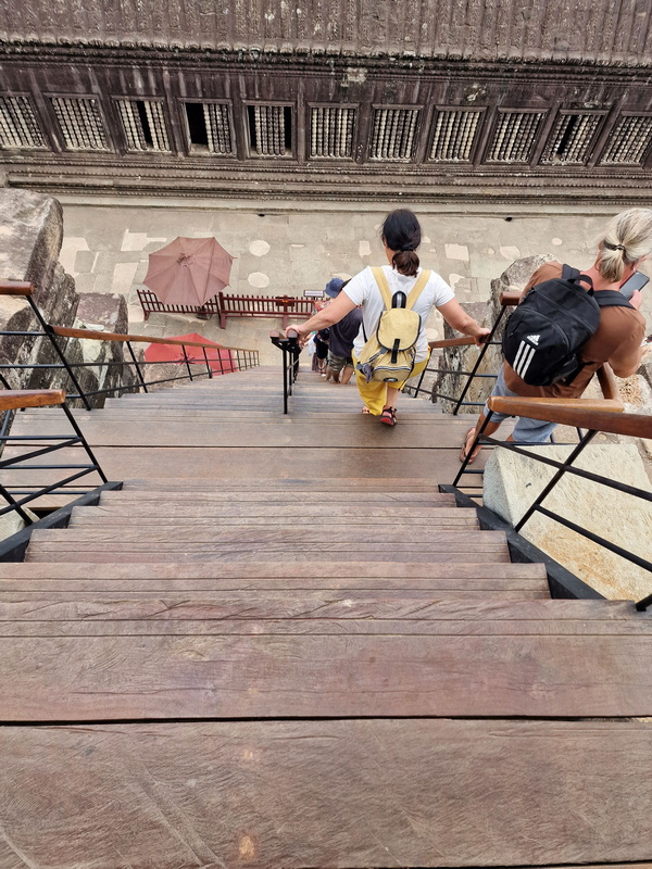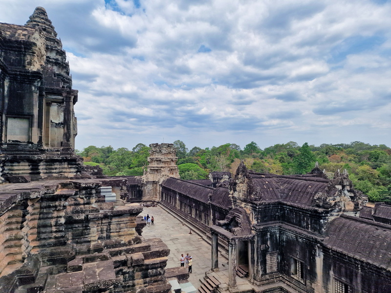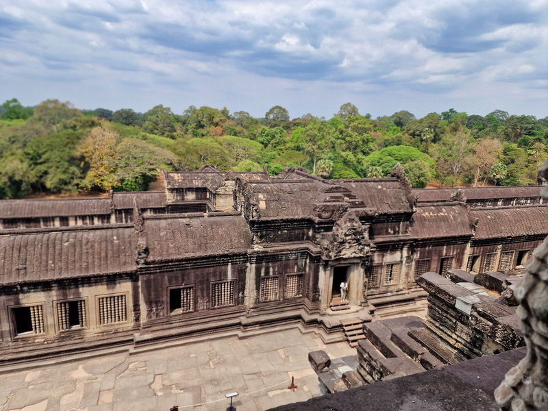 Der Aufstieg war so steil, wie es von unten ausgesehen hatte. Die schmalen Stufen forderten Konzentration, wahrscheinlich nicht ohne Grund – vielleicht sollte man den Tempel nicht einfach nebenbei betreten. Oben angekommen, bot sich ein fantastischer Blick über die Dächer der Galerien bis hin zum äußeren Wassergraben.